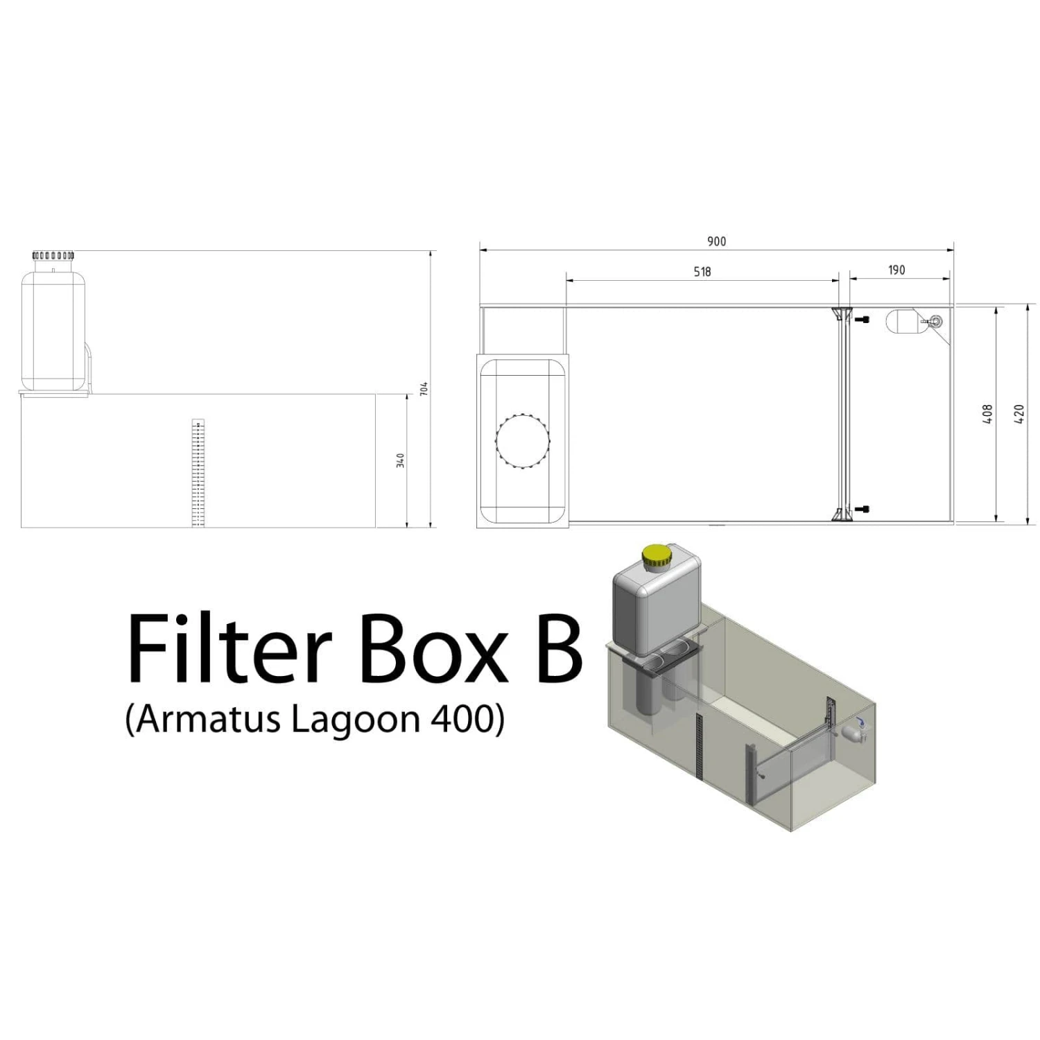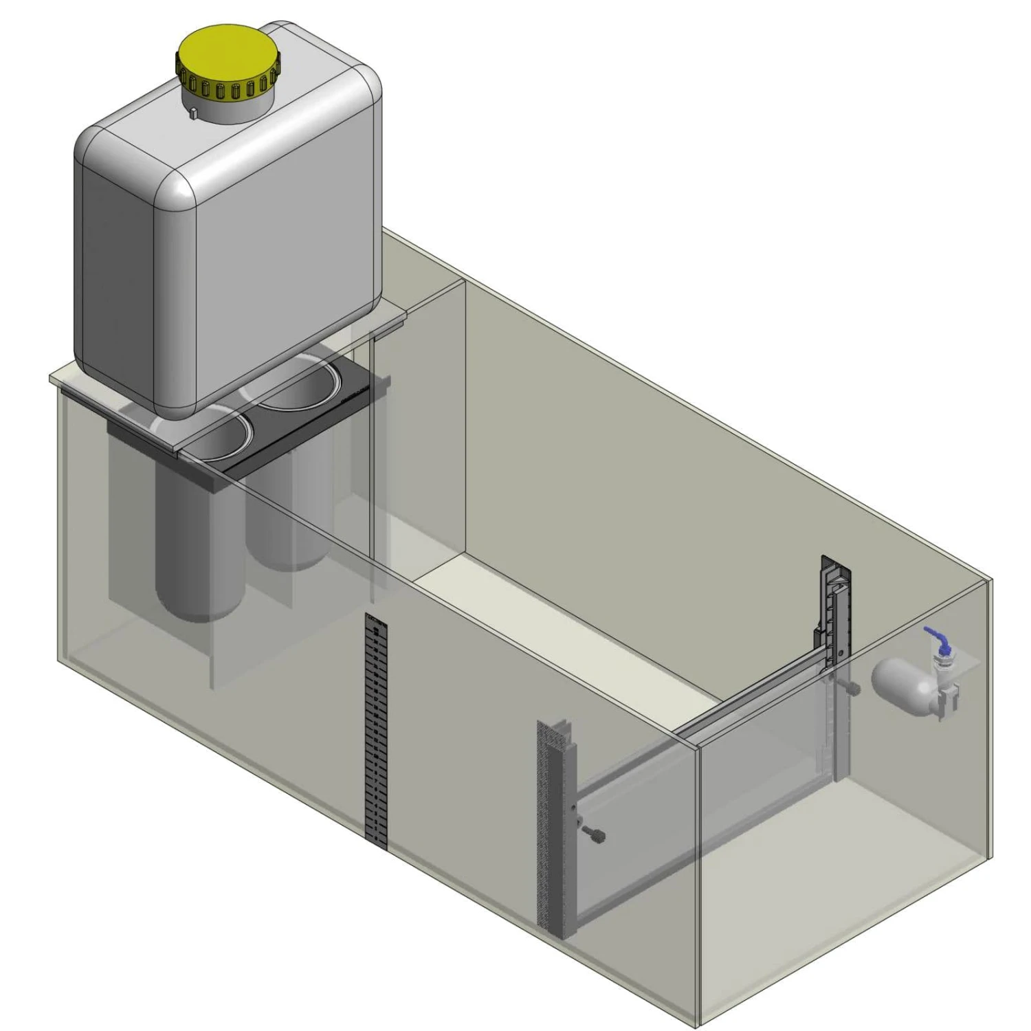 La cuve de décantation placée dans le meuble de cet aquarium AQUA MEDIC Armatus Lagoon 400 est doté d’un réglage du niveau d’eau et d’un système de remplissage automatique de l’eau d’évaporation. La zone d’arrivée d’eau présente des sacs filtrants interchangeables pour une pré-filtration fine qui permet en même temps de maintenir une décantation propre. La réserve d’eau est transportable pour être facilement rechargée. La cuve de décantation intégré est composée d’un compartiment de pré-filtration pour le positionnement libre d’un écumeur, multi-reactor etc. ainsi que de médias filtrants.