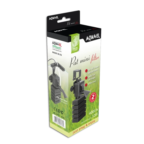 AQUAEL PAT Mini 400 L/h est un petit filtre interne pour aquarium jusqu’à 120L. Cet appareil se compose d’une petite tête et d’une éponge filtrante. Grâce à la conception innovante, le débit maximum de la tête de filtre atteint 400 L/h, ce qui est comparable à la performance typique d’un filtre d’aquarium à turbine de taille moyenne. Malgré ses performances élevées, le filtre fonctionne à une consommation de 4W ou moins.