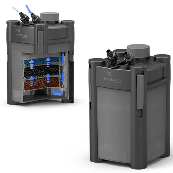 L’entretien de ce filtre externe est très facile. Avec le bloc de raccordement doté d’une vanne de fermeture et qui relie les tuyaux à la tête motrice, il est possible de la désolidariser en quelques secondes du filtre, sans risque de fuite et dons sans besoin de défaire toutes la tuyauterie de l’aquarium. Ainsi, pourrez emporter par exemple déplacer le filtre vers votre évier pour remplacer les cartouches filtrante, nettoyer la turbine, etc.