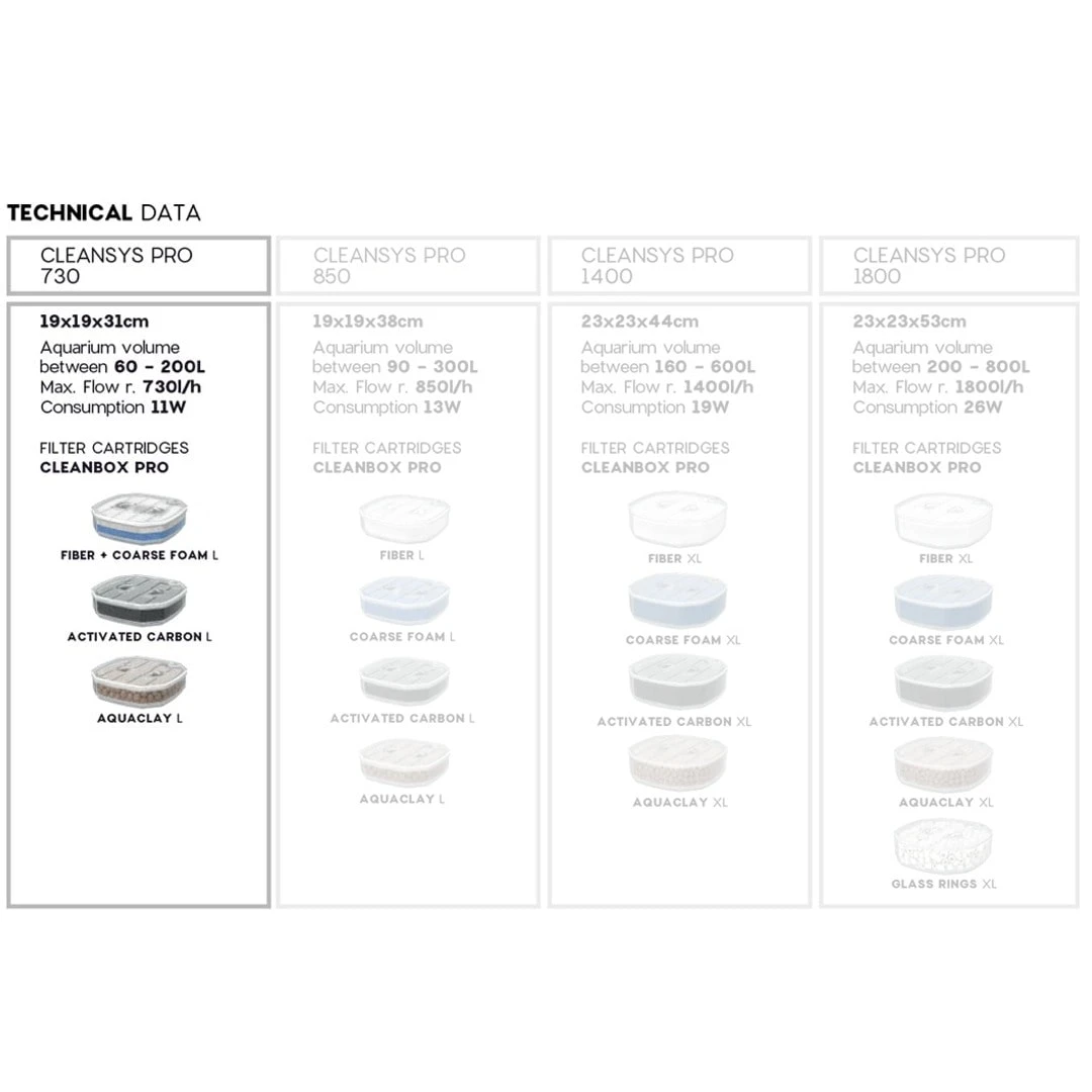 Le modèle de filtre 730 PRO, est livré avec 3 cartouches de filtrations CleanBox Pro, qui effectuent une filtration complète de l’aquarium :