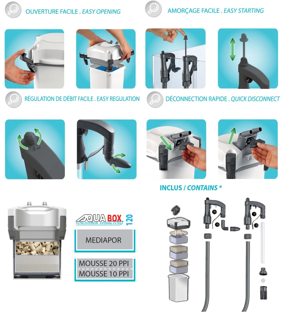 Le nouveau filtre externe AQUAVIE AquaBox 120 d’un débit de 540 L/h est idéal pour un aquarium de 40 à 120 L. Il est livré complet et prêt à l’emploi.