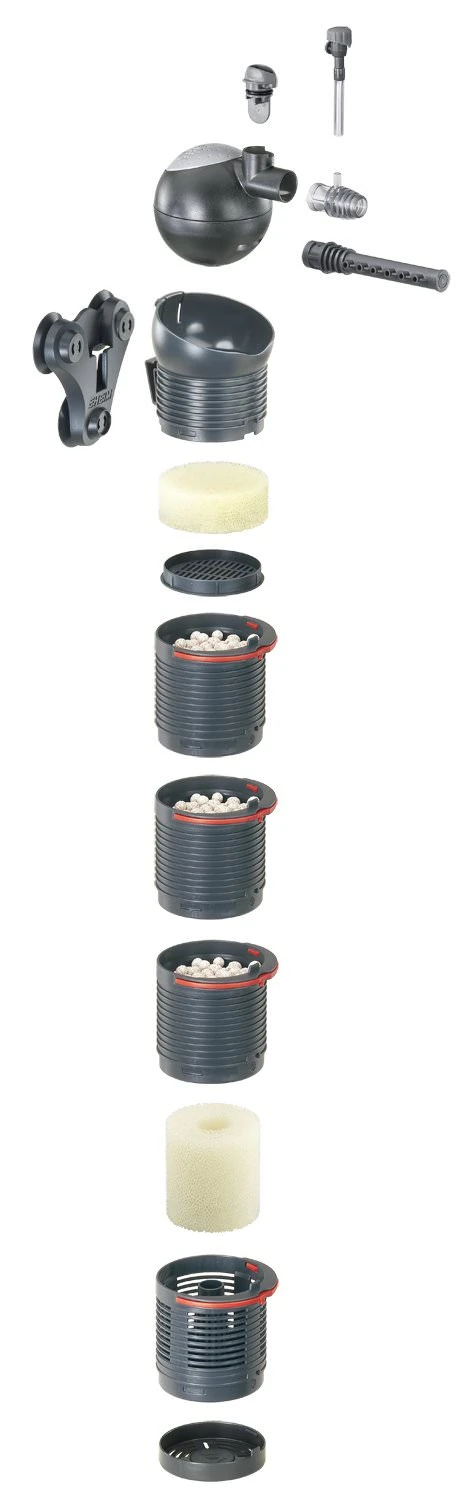 Filtration multiple, par étapes et par étages, comme dans un filtre extérieur EHEIM. Construction modulaire du filtre avec paniers de filtration fermés, remplis avec support bactérien performant SUBSTRATpro et un panier d’aspiration avec mousse EHEIM pour une pré-filtration mécanique et biologique.