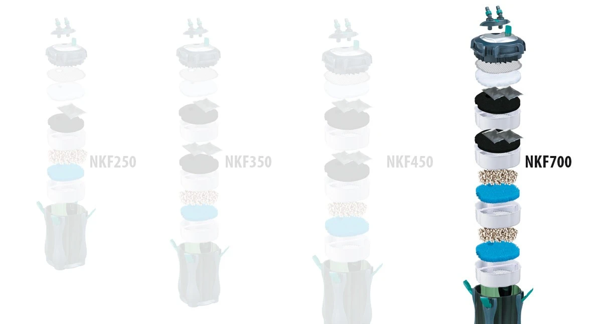 Le filtre extérieur NEWA Kanist 700 a également été optimisé pour assurer une haute efficacité de fonctionnement, avec une grande variété de possibilités qui permettent de garantir un résultat maximum au point de vu filtration mécanique, chimique et biologique. Dès la mise en marche, la pompe puissante commence à pomper l’eau dans le filtre NEWA Kanist 700 pour passer sur 6 stades de filtration. Le volume important des matériaux filtrants traitent tous les contaminants visibles et invisibles.